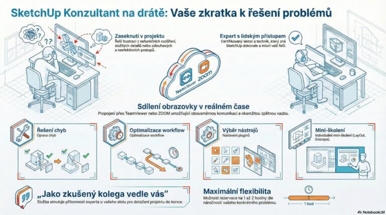 Stojíte před složitým problémem, se kterým si nevíte rady? Rozčiluje vás nějaké rozšíření, nebo máte pocit, že vaše postupy v aplikaci SketchUp by mohly být rychlejší a elegantnější? Pozvěte si našeho experta přímo do svého projektu – online a v reálném čase.